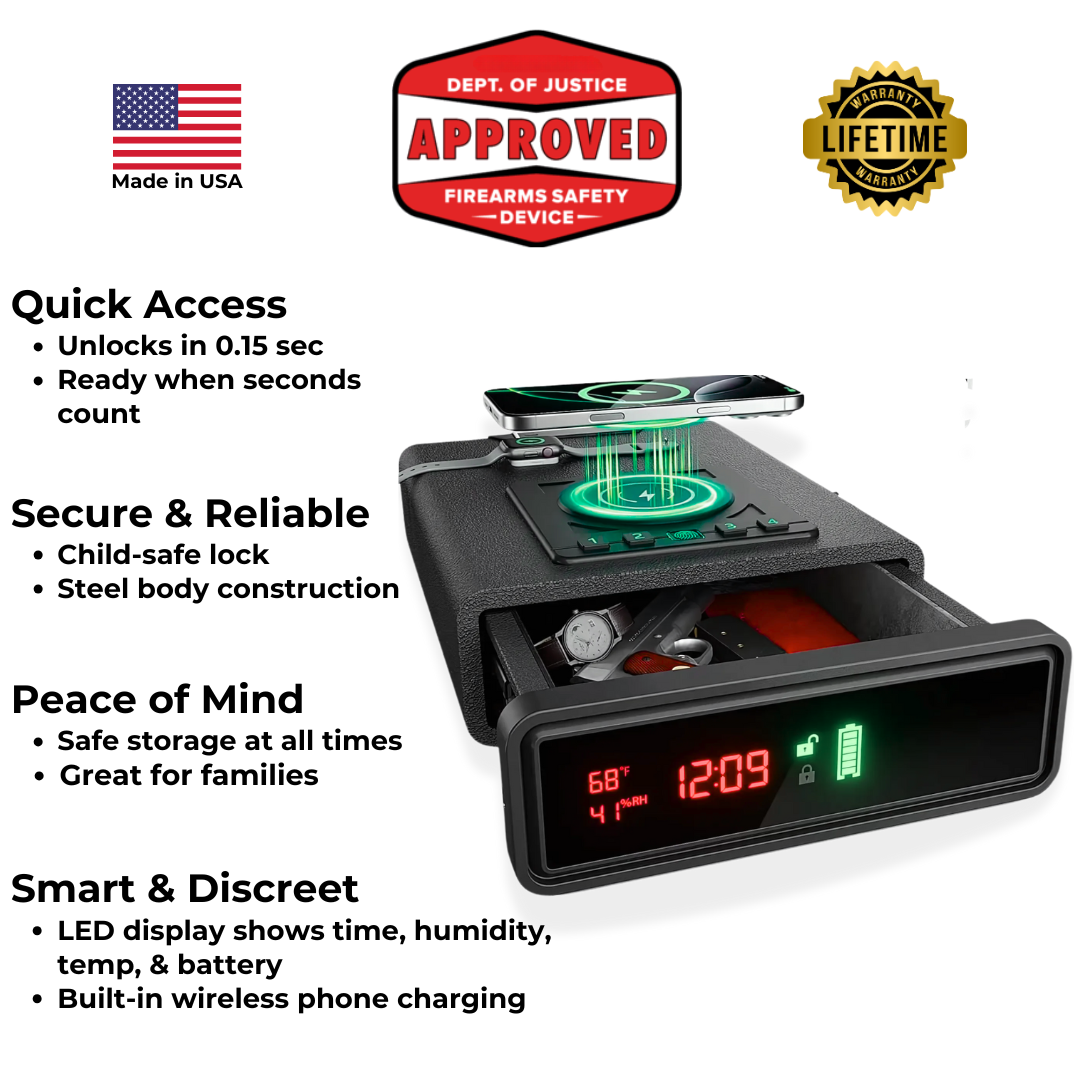 Secure your valuables discreetly and efficiently with the Knight Defender, the innovative biometric clock safe designed for modern homes. Seamlessly blending functionality and advanced security, this safe offers rapid fingerprint access, ensuring only authorized users can open it quickly when seconds matter.